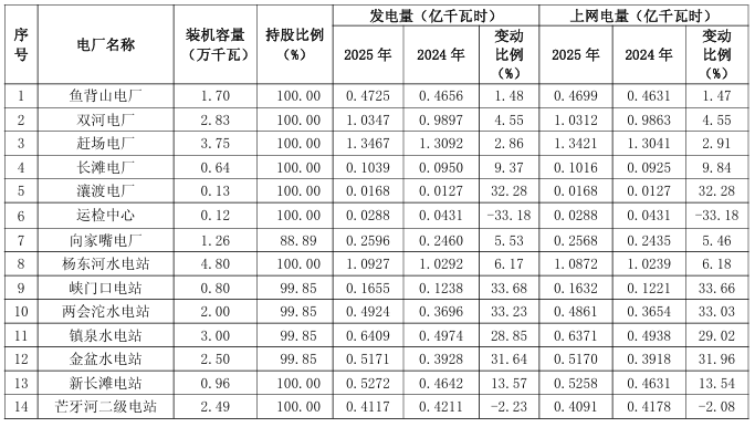 现将公司下属全资及控股公司各水电站2025年度发电量及上网电量完成情况公告如下: