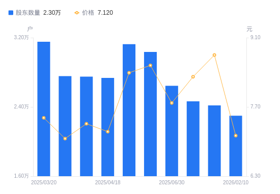 2月13日消息,数据显示,截至2026年2月10日,长江投资A股股东总户数为2.3万户,较上期(2025年9月30日)减少1189户,降幅4.92%。公司最新A股总股本为3.65亿股,其中流通A股3.65亿股,户均持有流通A股数量为1.59万股,较上期增加781.3股,增幅5.17%;户均持流通A股市值11.31万元,较上期减少1.91万元,降幅14.42%。