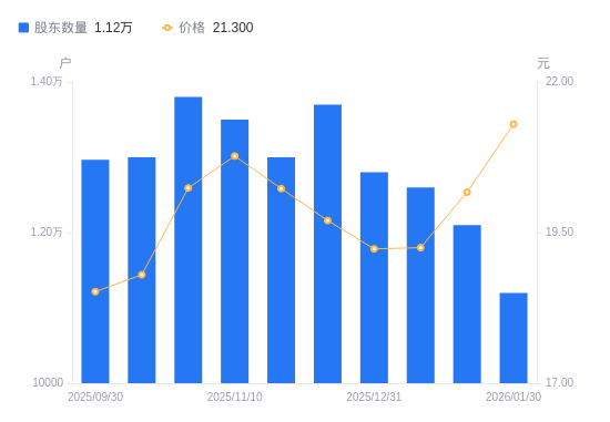 近一年(2025年3月31日至2026年1月30日),浪莎股份A股股东户数从9192户,增加至1.12万户,增幅21.85%,区间股价上涨46.55%。