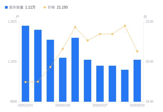 近一年(2025年3月31日至2026年3月20日),浪莎股份A股股东户数从9192户,增加至1.11万户,增幅20.76%,区间股价上涨45.52%。