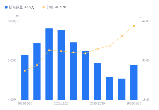 近一年(2025年2月28日至2026年1月30日),兴发集团A股股东户数从7.19万户,减低至4.89万户,降幅32.01%,区间股价上涨98.39%。
