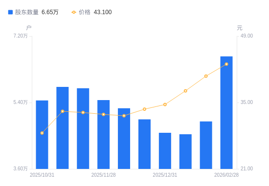 近一年(2025年2月28日至2026年2月28日),兴发集团A股股东户数从7.19万户,减低至6.65万户,降幅7.49%,区间股价上涨110.76%。