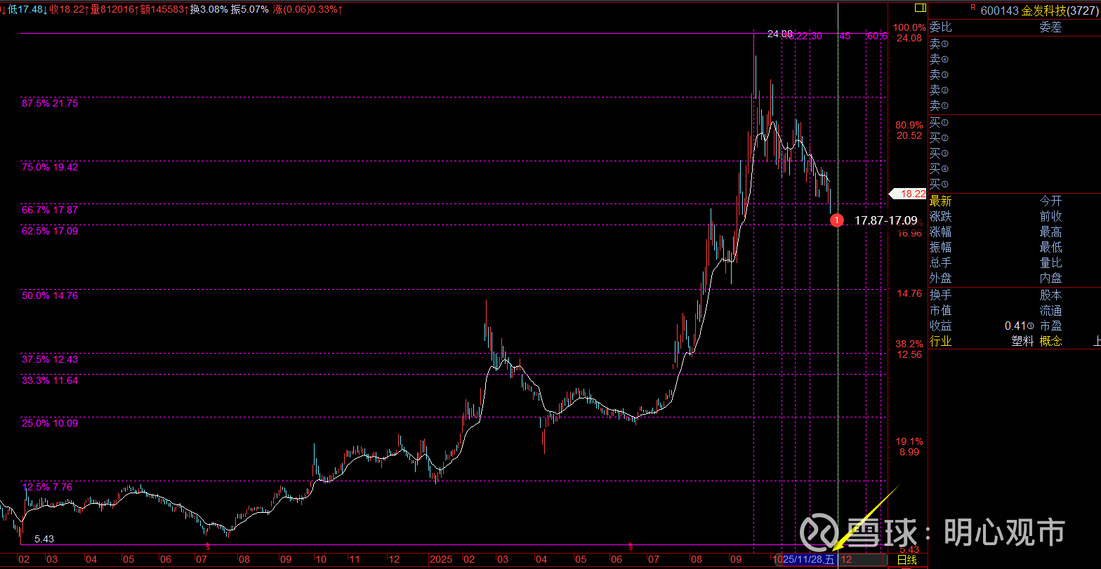 先锋电子,还是熟悉的老朋友,一动就好加速的主~这里看一张周图:趋势,红白两条多空线对应13.3-13.18上看多,价格叠加百分比显示,53.75下跌的875位对应14,近循环的半分对应14.56,14-14.56构成当前价格关键区;能突破站到14.56上方,则波段有去19.25-19.68的预期。当前支撑14,短压14.56,突破...