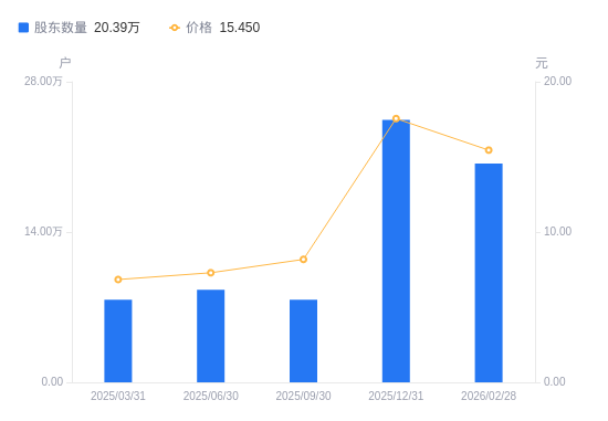 3月26日消息,数据显示,截至2025年12月31日,航天机电A股股东总户数为24.45万户,较上期(2025年9月30日)增加16.77万户,增幅218.20%。公司最新A股总股本为14.34亿股,其中流通A股14.34亿股,户均持有流通A股数量为5865.39股,较上期减少1.28万股,降幅68.57%;户均持流通A股市值10.29万元,较上期减少4.97万元,降幅32.57%。
