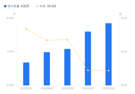 近一年(2025年2月28日至2026年2月28日),天坛生物A股股东户数从7.25万户,增加至8.82万户,增幅21.69%,区间股价下跌17.67%。