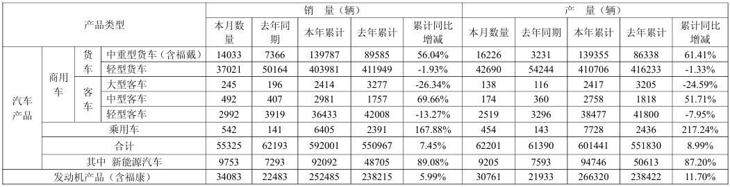 整体来看,福田汽车在部分产品线的销量和产量均有显著增长,尤其是在新能源汽车和商用车的表现上。