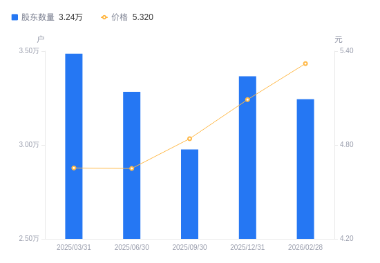 近一年(2024年12月31日至2025年12月31日),武汉控股A股股东户数从3.15万户,增加至3.37万户,增幅6.94%,区间股价上涨14.30%。