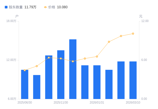 3月20日消息,数据显示,截至2026年2月27日,黄河旋风A股股东总户数为11.79万户,较上期(2026年2月24日)增加1.29万户,增幅12.29%。公司最新A股总股本为14.42亿股,其中流通A股12.76亿股,户均持有流通A股数量为1.08万股,较上期减少1329.92股,降幅10.94%;户均持流通A股市值10.51万元,较上期减少2095.7元,降幅1.95%。
