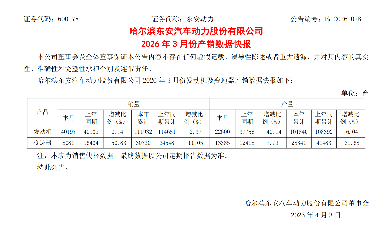 4月2日,东安动力(600178)(600178.SH)发布了2026年3月份产销数据快报。