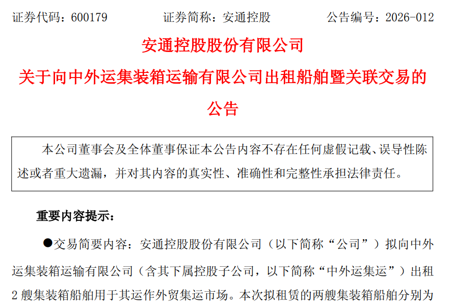3月23日晚间,安通控股股份有限公司(以下简称“安通控股”或“公司”)发布公告称,拟向中外运集装箱运输有限公司(含其下属控股子公司,以下简称“中外运集运”)出租2艘集装箱船舶,用于其运作外贸集运市场。