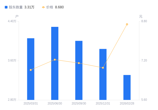 3月30日消息,数据显示,截至2026年2月28日,泉阳泉A股股东总户数为3.31万户,较上期(2025年12月31日)减少5318户,降幅13.85%。公司最新A股总股本为7.15亿股,其中流通A股7.15亿股,户均持有流通A股数量为2.16万股,较上期增加2996.53股,增幅16.08%;户均持流通A股市值18.77万元,较上期增加5.9万元,增幅45.82%。