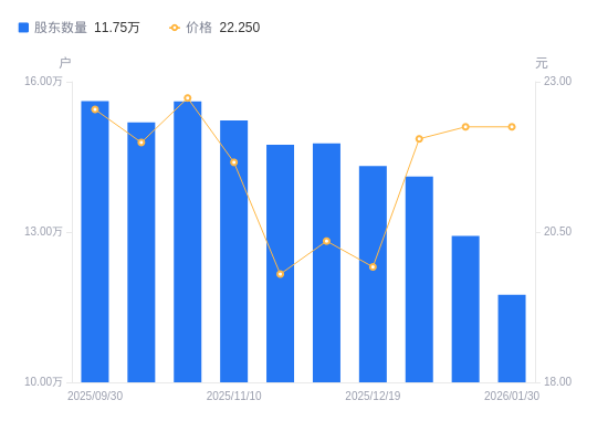 近一年(2025年2月10日至2026年1月30日),有研新材A股股东户数从14.99万户,减低至11.75万户,降幅21.61%,区间股价上涨30.34%。
