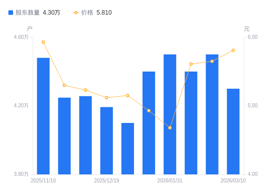 3月13日消息,数据显示,截至2026年3月10日,安彩高科A股股东总户数为4.3万户,较上期(2026年2月28日)减少2000户,降幅4.44%。公司最新A股总股本为10.89亿股,其中流通A股10.89亿股,户均持有流通A股数量为2.53万股,较上期增加1125.9股,增幅4.65%;户均持流通A股市值14.72万元,较上期增加1.04万元,增幅7.61%。