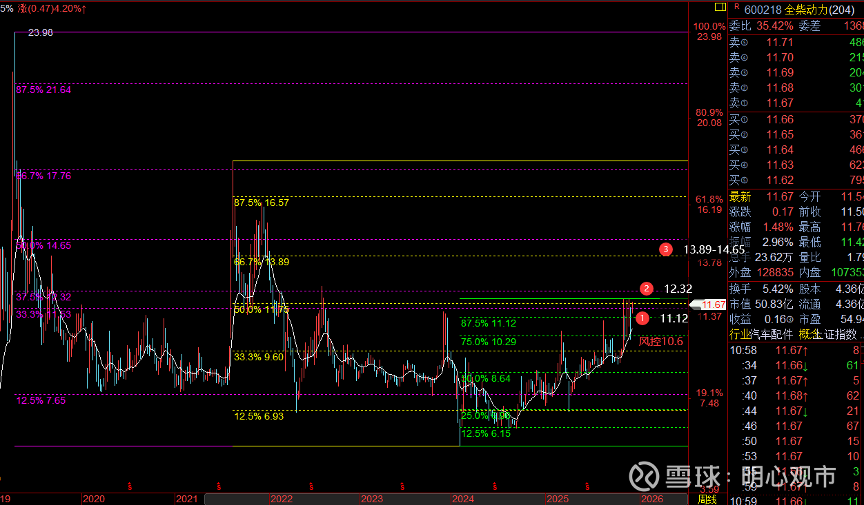 现在进入到11.53-12.32这个粉线级别的大三分位,叠加近循环来说,当前支撑11.1,该位置上可先跟踪12.32的突破,这里趋势能保持住,方向是继续往13.89、14.65;波段风控参考周白线10.6