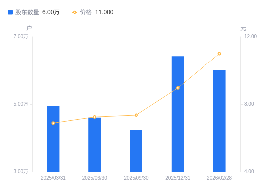 3月16日消息,数据显示,截至2025年12月31日,铜峰电子A股股东总户数为6.42万户,较上期(2025年9月30日)增加2.19万户,增幅51.58%。公司最新A股总股本为6.31亿股,其中流通A股6.22亿股,户均持有流通A股数量为9681.92股,较上期减少4994.1股,降幅34.03%;户均持流通A股市值8.68万元,较上期减少2.13万元,降幅19.69%。