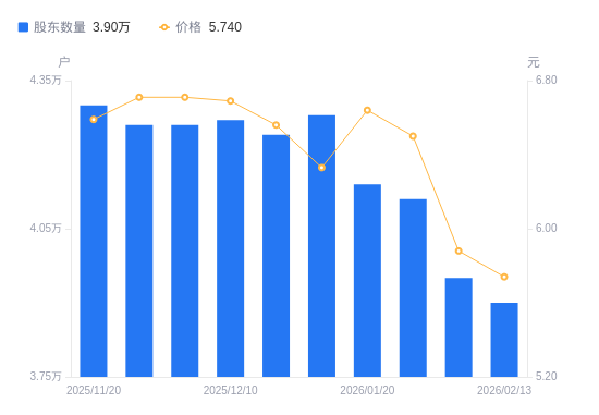 近一年(2025年2月20日至2026年2月13日),*ST椰岛A股股东户数从7.3万户,减低至3.9万户,降幅46.58%,区间股价下跌1.71%。