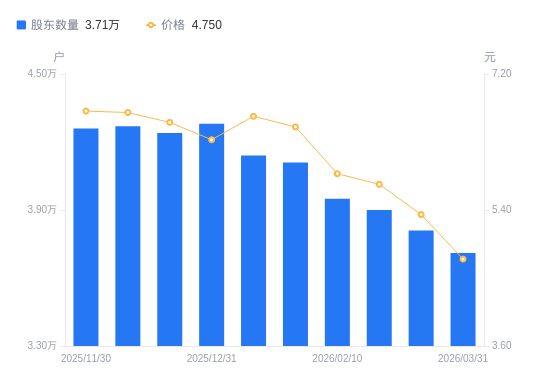 近一年(2025年3月31日至2026年3月31日),*ST椰岛A股股东户数从7.57万户,减低至3.71万户,降幅50.97%,区间股价下跌23.88%。