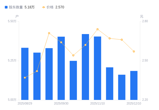 近一年(2024年12月31日至2025年12月10日),云南城投A股股东户数从6.6万户,减低至5.18万户,降幅21.47%,区间股价下跌6.20%。
