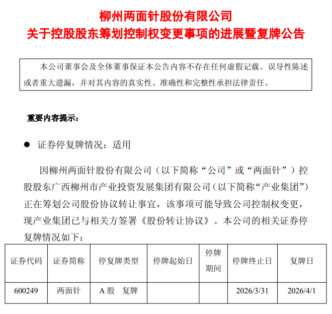 公司控股股东将变更为广西国控,实际控制人将由柳州市人民政府国有资产监督管理委员会变更为广西壮族自治区人民政府国有资产监督管理委员会。公司股票将于4月1日复牌。