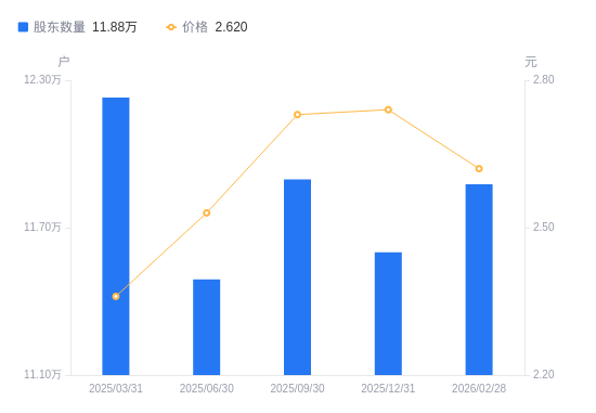 近一年(2024年12月31日至2025年12月31日),中恒集团A股股东户数从12.21万户,减低至11.6万户,降幅5.03%,区间股价上涨8.30%。