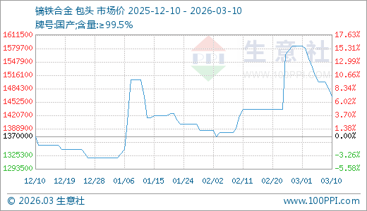 据生意社监测,镝铁合金03月10日最新价格1465000.00万元/吨,最近30天上涨6.16%,90天上涨6.93%。