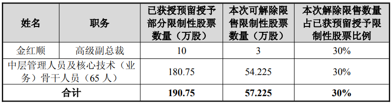根据公告,本次解除限售的股票数量为57万股,将于2026年2月24日上市流通。此次解除限售条件已满足,涉及66名激励对象,解除限售的股票占公司目前总股本的0.05%。