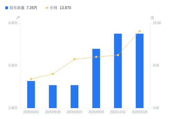 3月26日消息,数据显示,截至2025年12月31日,国电南自A股股东总户数为7.25万户,较上期(2025年9月30日)增加1.07万户,增幅17.23%。公司最新A股总股本为10.16亿股,其中流通A股10.11亿股,户均持有流通A股数量为1.39万股,较上期减少2399.06股,降幅14.69%;户均持流通A股市值14.6万元,较上期减少2.11万元,降幅12.60%。