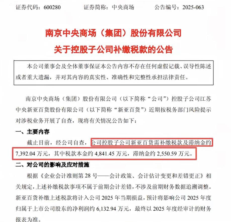 据公司近日公告,其控股子公司江苏中央新亚百货股份有限公司近期在税务部门风险提示下开展自查,确认需补缴税款及滞纳金合计约7392.04万元。其中,税款本金约为4841.45万元,滞纳金约2550.59万元。公司预估,此项补缴将对2025年度归属于上市公司股东的净利润产生约6132.94万元的负面影响。