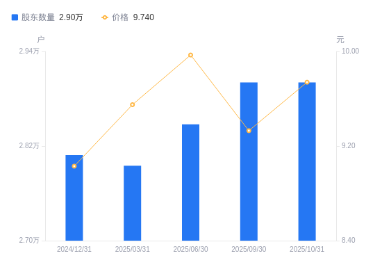 近一年(2024年12月31日至2025年10月31日),钱江水利A股股东户数从2.81万户,增加至2.9万户,增幅3.28%,区间股价上涨6.45%。
