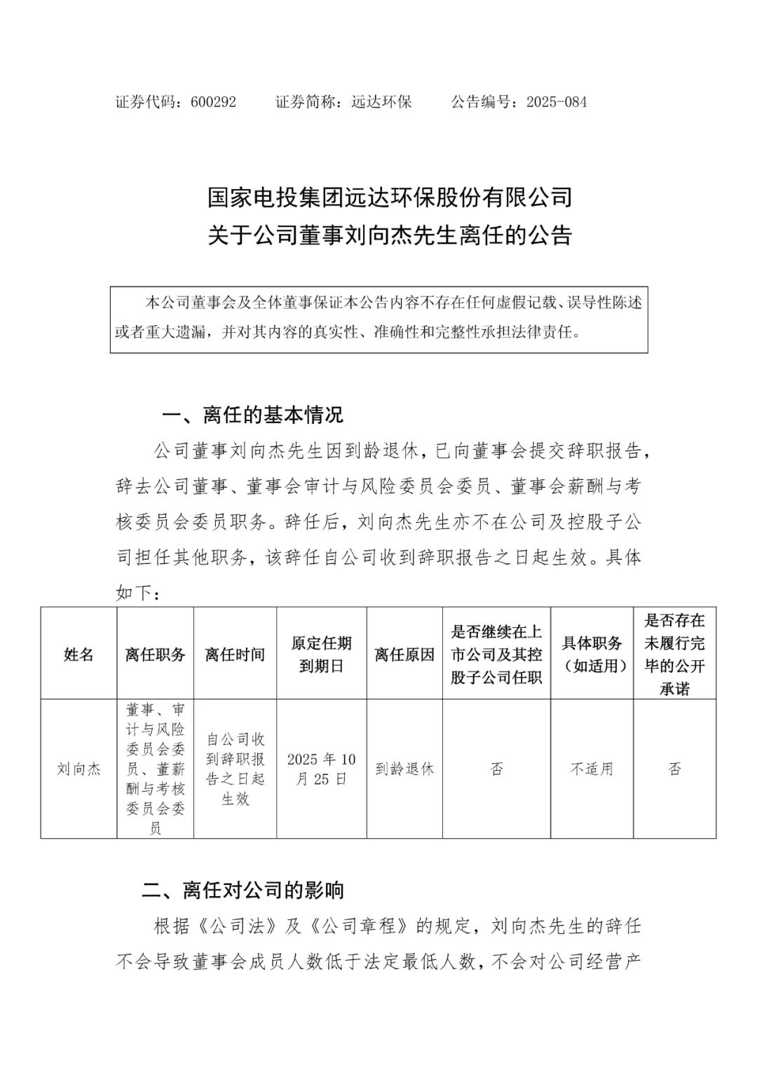 刘向杰辞去国家电投集团远达环保股份有限公司(以下简称“远达环保”)董事职务。