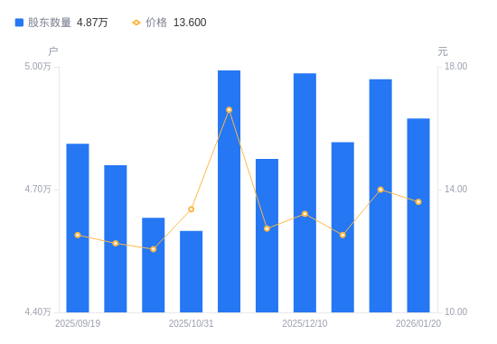 近一年(2025年1月20日至2026年1月20日),电投水电A股股东户数从5.44万户,减低至4.87万户,降幅10.37%,区间股价上涨11.66%。