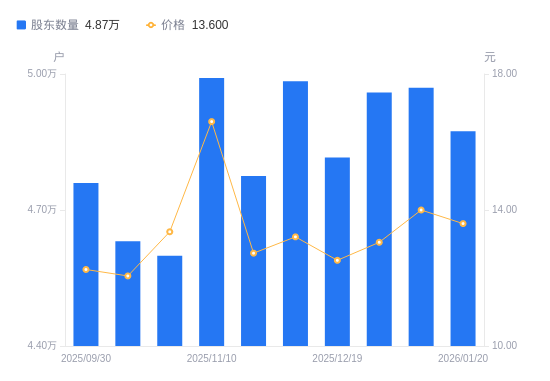近一年(2024年12月31日至2025年12月31日),电投水电A股股东户数从5.99万户,减低至4.96万户,降幅17.27%,区间股价下跌0.68%。