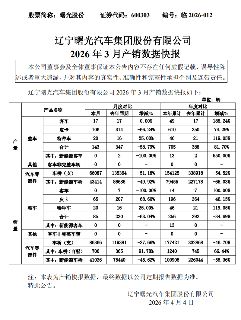 4月3日,曙光股份(600303)(600303.SH)发布了2026年3月产销数据快报。