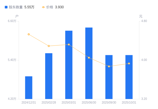 近一年(2024年12月31日至2025年10月31日),广西能源A股股东户数从4.9万户,增加至5.55万户,增幅13.35%,区间股价下跌14.57%。