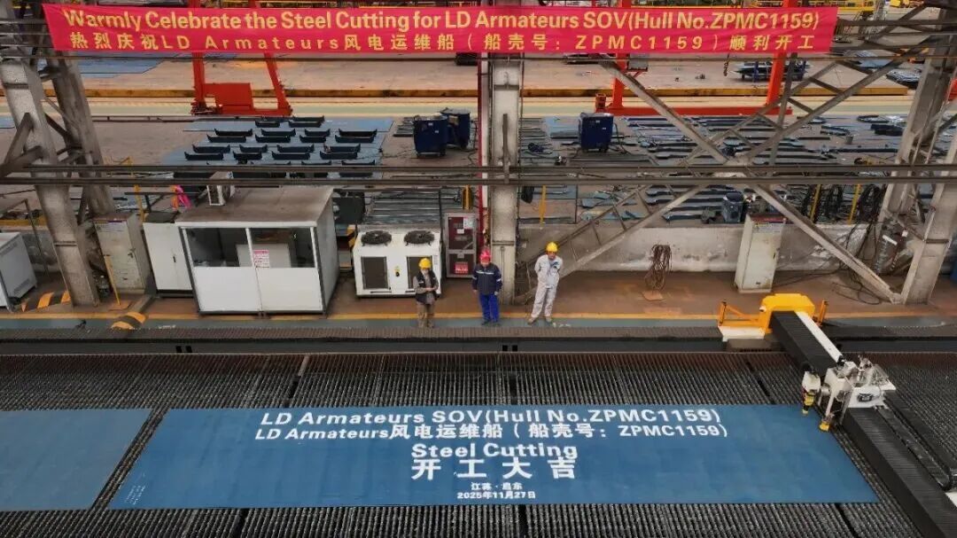 11月27日,上海振华重工集团为法国路易达孚航运集团(LD Armateurs,简称LDA)建造的风电运维母船项目在振华海工举行开工仪式。