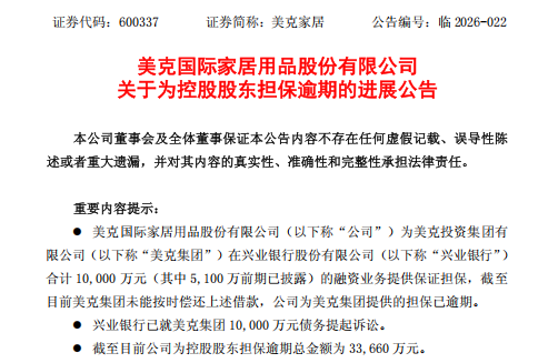 2026年3月,美克家居(600337)的债务危机再度升级。6日,公司发布公告披露,为控股股东美克集团在兴业银行的1亿元融资提供的担保陷入逾期困境,其中5100万元已逾期,剩余4900万元被银行提前到期处理,兴业银行已就全部债务提起诉讼,要求美克家居履行连带担保责任。这起诉讼不仅让公司担保逾期总额进一步扩大,更将这家深陷财务泥潭的家居企业推向了更艰难的生存境地。