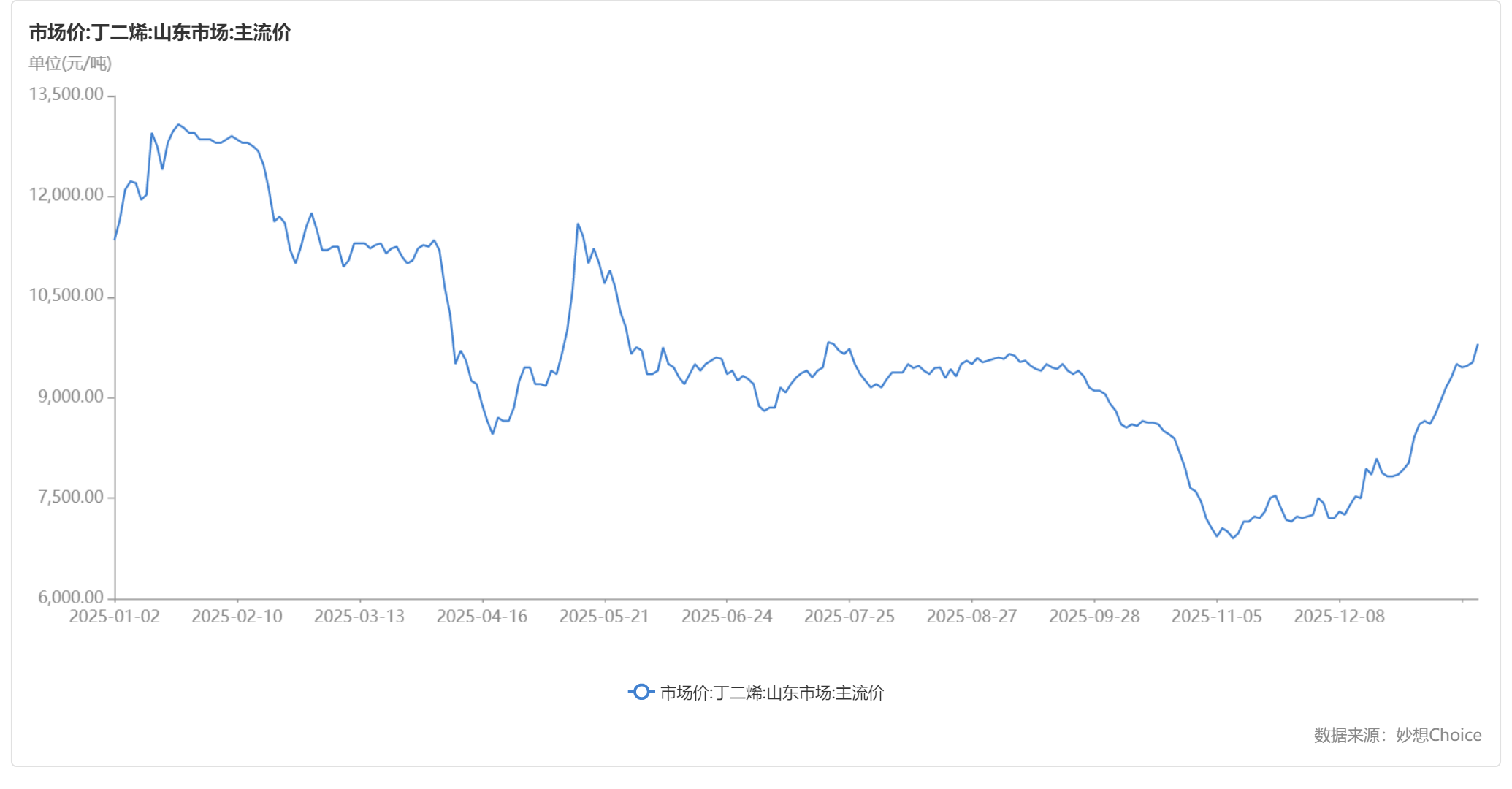 截至今日,山东鲁中地区丁二烯送到价格约9800元/吨,本月以来涨幅12%,较去年11月低位回弹超过40%。