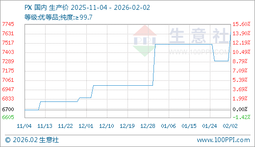 据生意社监测,PX02月02日最新价格7650.00元/吨,最近5天上涨4.79%。