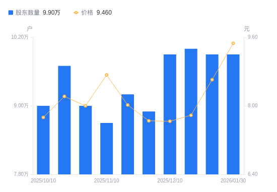 2月3日消息,数据显示,截至2026年1月30日,华阳股份A股股东总户数为9.9万户,较上期(2026年1月9日)不变。公司最新A股总股本为36.08亿股,其中流通A股36.08亿股,户均持有流通A股数量为3.64万股,较上期不变;户均持流通A股市值34.47万元,较上期增加3.1万元,增幅9.87%。