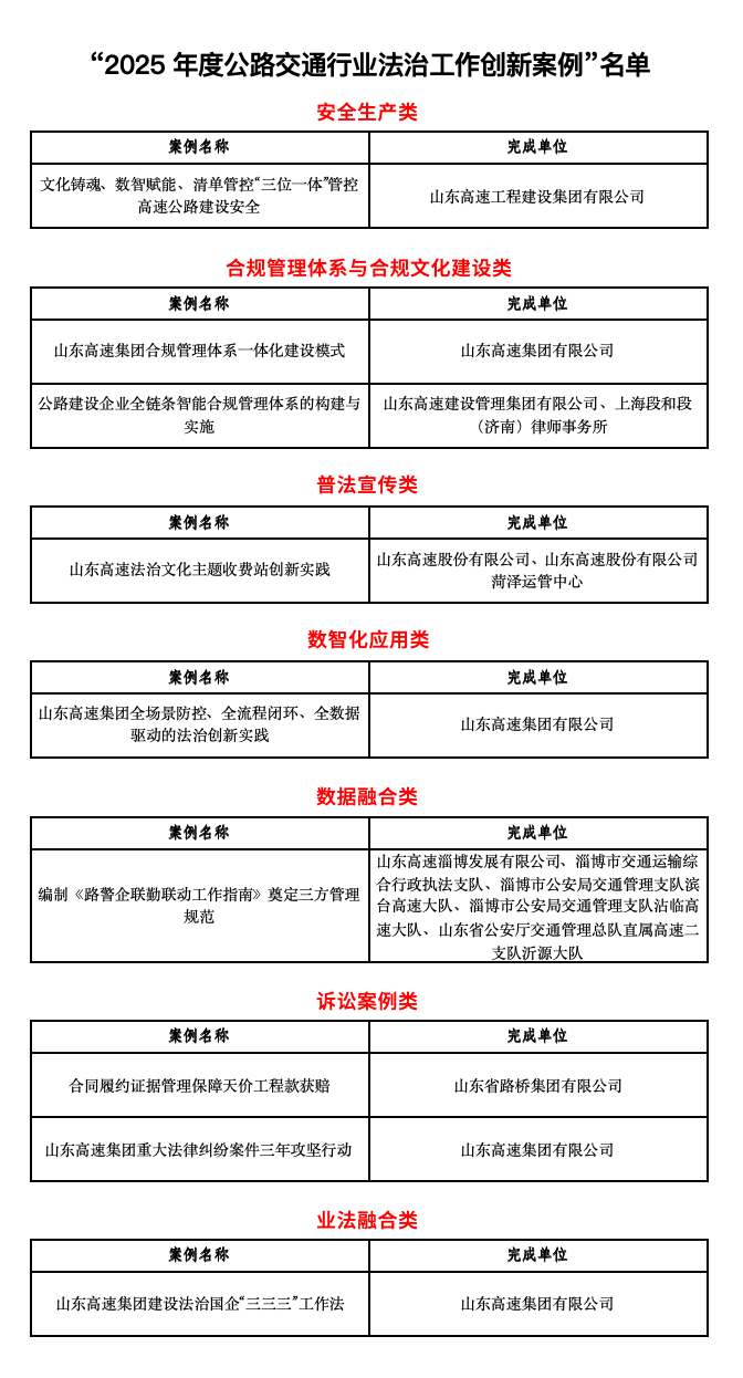 经过多轮筛选,本次活动共评选出合规管理、普法宣传、数智化应用、数据融合、诉讼案例、业法融合、优化营商环境、行政执法等10类95个法治工作创新案例。集团及集团权属单位高速股份、路桥股份、建设管理集团、淄博发展公司申报的“山东高速集团重大法律纠纷三年攻坚行动”“山东高速法治文化主题收费站创新实践”“合同履约证据管理保障天价工程款获赔”“公路建设企业全链条智能合规管理体系的构建与实施”“路警企联勤联动工作指南”等9个创新案例成功入选。