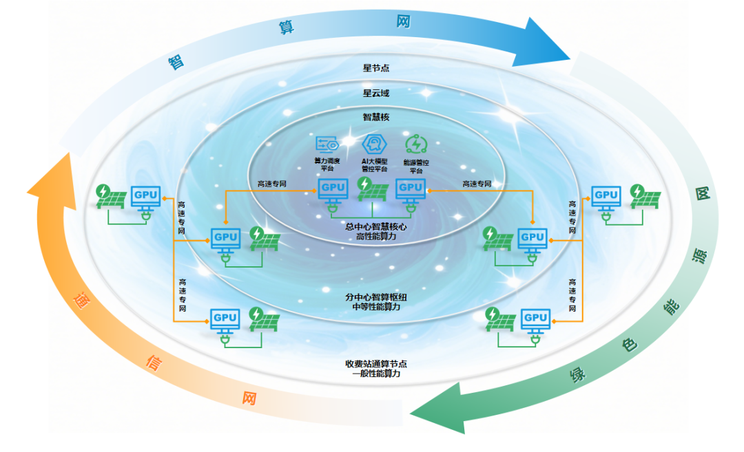 该项目采用“一核多域千星”分层分布式架构,涵盖集团总中心、各分中心及沿线收费站(隧管所),规划智能算力规模达300P,并配套28兆瓦清洁电力。项目整合集团路域分布式算力资源,以及风电、光伏等绿色电力资源,打造“算力—网络—绿能”三元融合的新型智能算力基础设施,同步融入大模型等前沿技术,为集团及相关业务单位提供全方位的算力支持、大模型应用能力以及专业的机房环境保障。