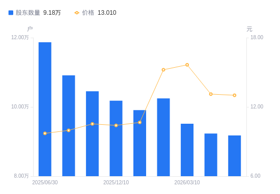 4月1日消息,数据显示,截至2026年3月31日,浙江龙盛A股股东总户数为9.18万户,较上期(2026年3月20日)减少534户,降幅0.58%。公司最新A股总股本为32.53亿股,其中流通A股32.53亿股,户均持有流通A股数量为3.54万股,较上期增加205.07股,增幅0.58%;户均持流通A股市值46.12万元,较上期减少856.42元,降幅0.19%。