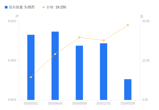3月19日消息,数据显示,截至2026年2月28日,旭光电子A股股东总户数为5.05万户,较上期(2025年12月31日)减少1.83万户,降幅26.56%。公司最新A股总股本为8.3亿股,其中流通A股8.29亿股,户均持有流通A股数量为1.64万股,较上期增加4356.19股,增幅36.17%;户均持流通A股市值31.57万元,较上期增加12.16万元,增幅62.61%。