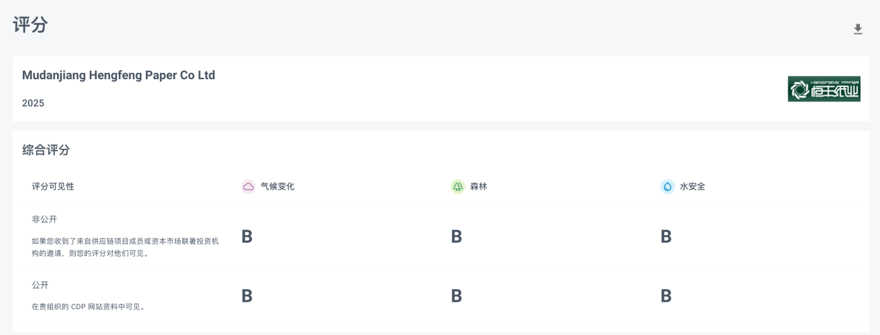 近日,全球权威环境信息披露平台CDP(全球环境信息研究中心)公布了2025年度企业评级结果。恒丰纸业(600356)在气候、水安全、森林三项问卷评级中均获评B级,实现了从2024年度的“水B、气候B、森林B-”到本年度“三项全B级”的巩固与提升。这表明公司在低碳转型与可持续发展方面的实践已获得国际权威机构的高度认可,整体环境管理水平处于国内造纸行业领先位置。