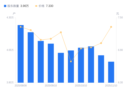 近一年(2024年12月31日至2025年11月10日),新农开发A股股东户数从4.47万户,减低至3.96万户,降幅11.47%,区间股价上涨12.60%。
