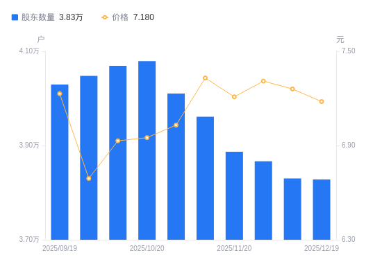 近一年(2024年12月31日至2025年12月19日),新农开发A股股东户数从4.47万户,减低至3.83万户,降幅14.44%,区间股价上涨10.29%。