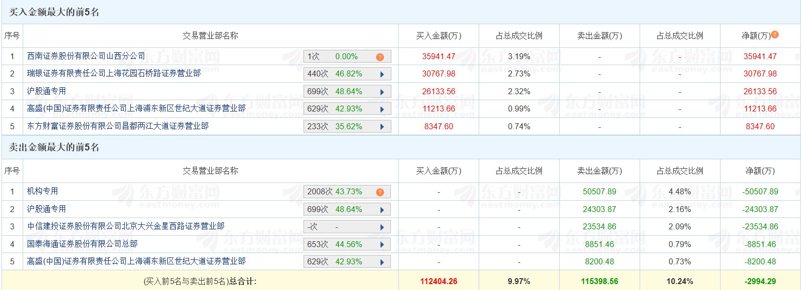 江西铜业(600362.SH)今日涨9.56%,换手率8.15%,成交额112.74亿元。龙虎榜数据显示,一家机构位列卖一席位,卖出5.05亿元;游资“量化基金”位列买二、买四、卖四及卖五席位,净买入2.49亿元。(格隆汇)