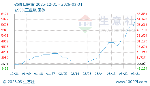 据生意社监测,硫磺03月31日最新价格5943.33元/吨,最近5天上涨8.06%,10天上涨23.39%,20天上涨25.12%,30天上涨52.00%,90天上涨62.34%。