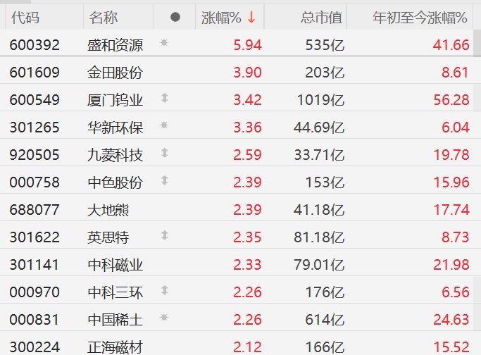 格隆汇2月12日|A股市场稀土概念股普涨,其中,盛和资源涨近6%,金田股份、厦门钨业、华新环保涨超3%。消息面上,根据包头稀土产品交易所数据,截至2月11日,氧化镨均价达到87.7万元/吨,今年以来涨价超26万元/吨,涨幅43.42%;氧化钕均价达到87万元/吨,今年以来涨价26万元/吨,涨幅42.62%;氧化镨钕、金属钕、金属镨年内累计涨幅均在35%以上。