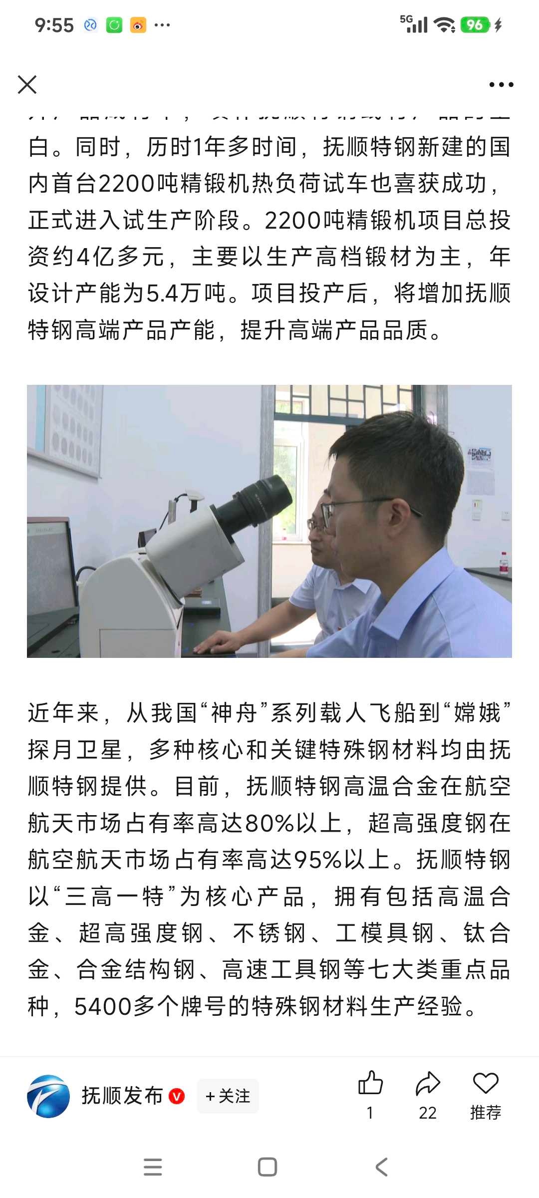 推荐一个还在低位的商业航天概念股,股价还在上证2900位置。最近大涨的航空航天锻件股的上游高温合金,抚顺特钢产能国内第一!